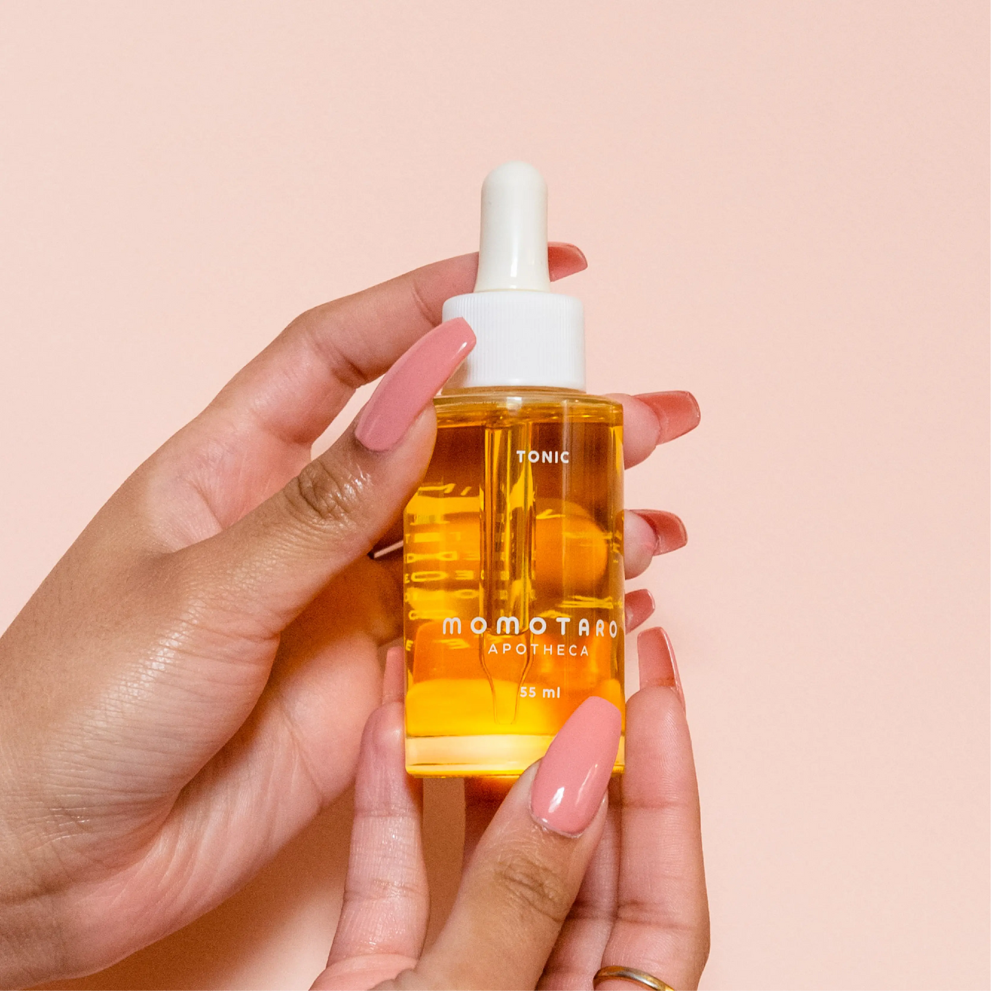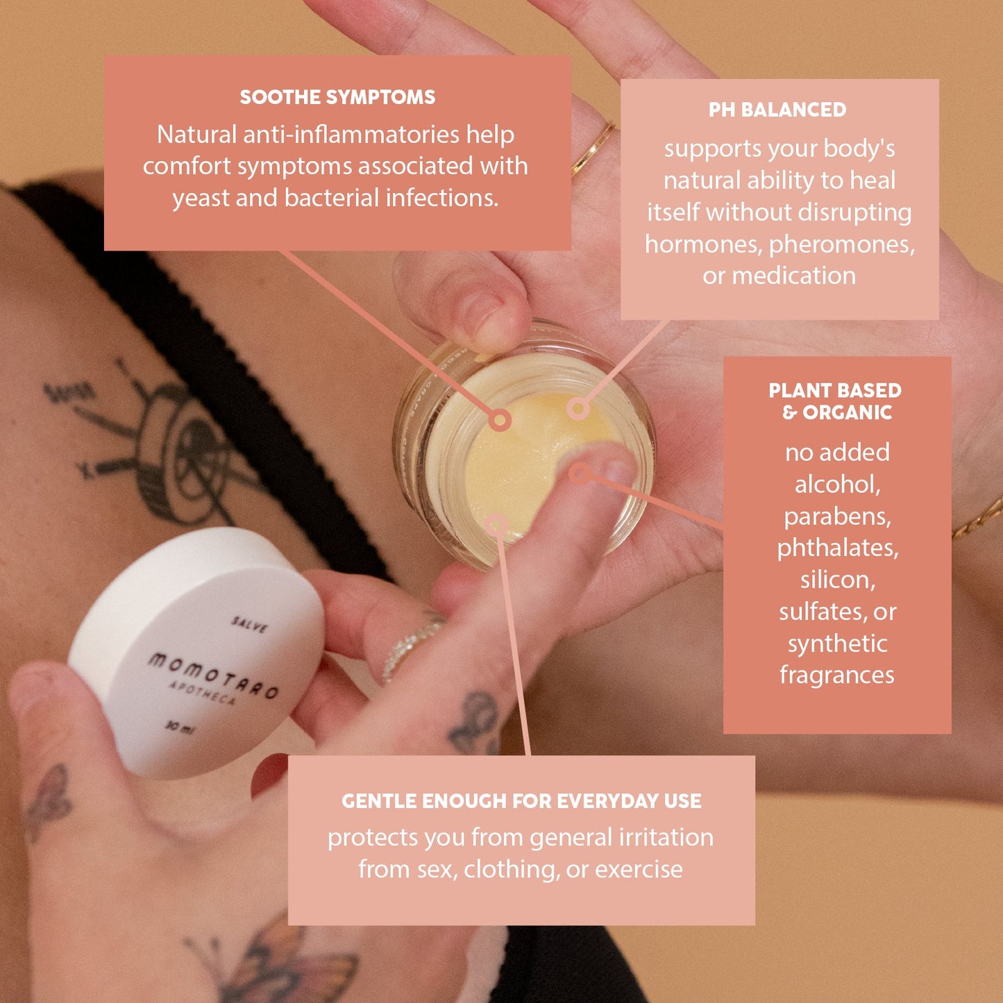 Momotaro Apotheca Salve, Hydrosol, Tonic, Body Oil, Suppository, and Urinary Tract Supplement on tan background.